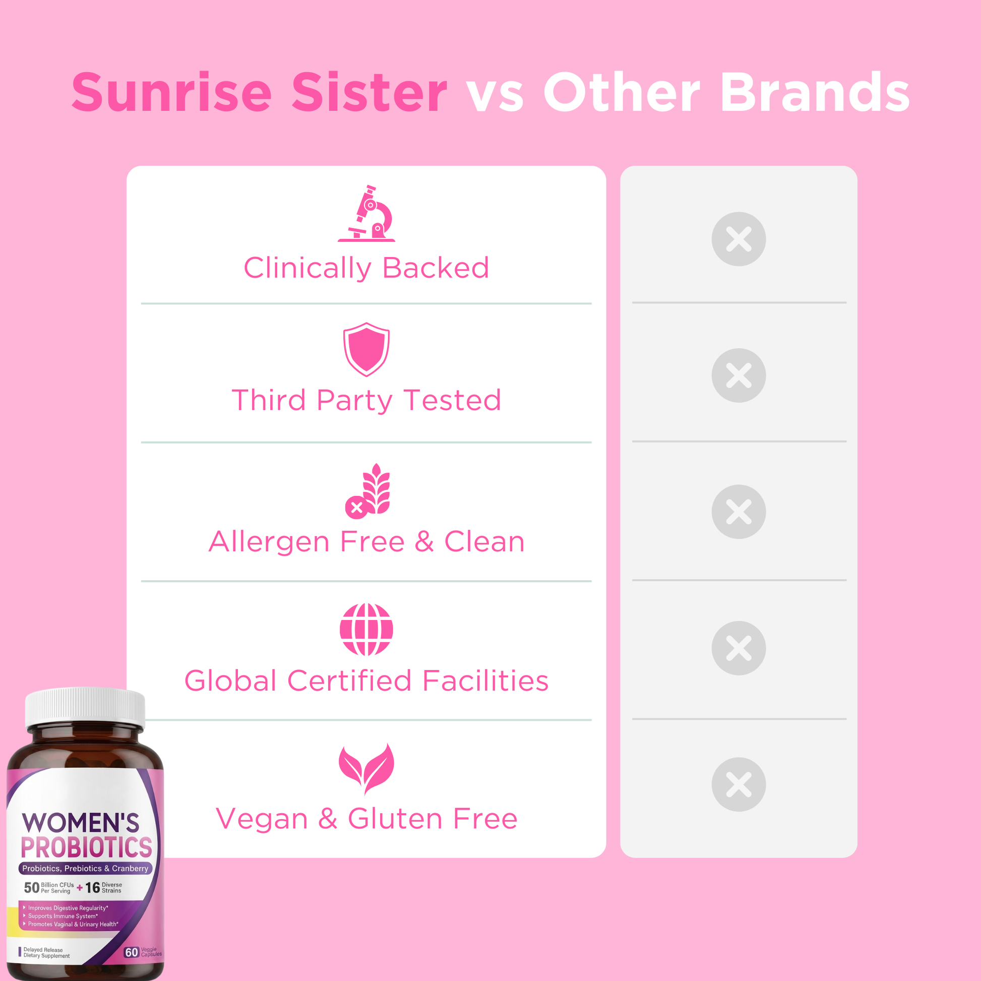 Your body deserves more than empty claims. Sunrise Sister's Probiotics supports key areas of women's health using strains studied in clinical research.